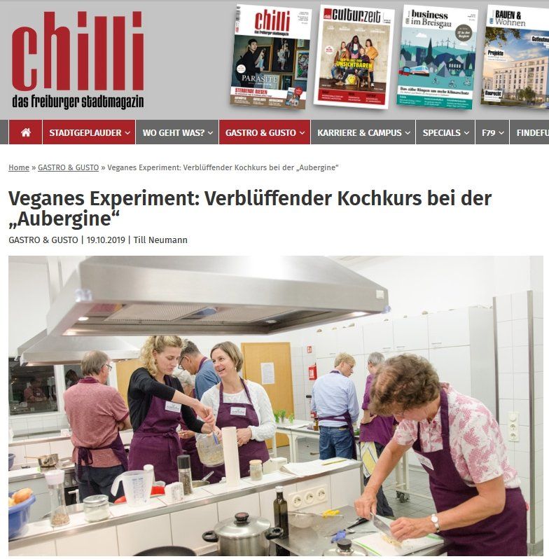 - "Wir hatten einen tollen Abend, haben nette Menschen getroffen und unglaublich viel gelernt! Besonders eindrucksvoll fanden wir, wie natürlich die vegane Küche ist. Wir waren sehr begeistert davon, wie einfach man mit ein bisschen Kreativität und innovativen Ideen auch auf Milchprodukte oder Eier verzichten kann. Der Abend mit der Kochschule Aubergine hat uns wieder einmal gezeigt, wie einfach es ist, die Freude an leckerem Essen mit einem gesunden und nachhaltigen Leben und dem Schutz unserer Umwelt zu vereinen. Vielen Dank dafür!" - Sebastian F., Freiburg
